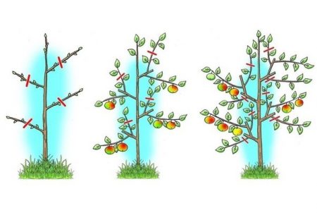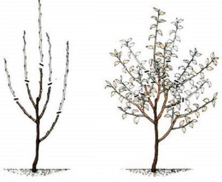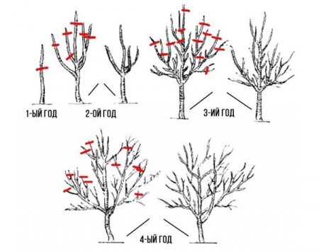 ไม่กี่ปีแรกหลังจากปลูกต้นกล้ามันจะต้องเชื่อมโยงกับการสนับสนุน สิ่งนี้จะทำให้เขาไม่แตกและไม่ตาย ในตอนต้นของฤดูใบไม้ผลิเต็มครั้งแรกหลังจากปลูกต้นไม้หน่อจะต้องสั้นลงสองตา (ไม่มาก) ในกรณีนี้คุณสามารถเติบโตได้มากขึ้น หลังจากนั้นอีกหนึ่งปีไม่ควรปล่อยกิ่งแนวนอนทั้งหมด แต่กิ่งที่เติบโตในแนวตั้งควรถูกทำให้สั้นลงอีกสองตา ในสาขาแนวนอนที่มีอยู่ในปีนี้เราควรคาดหวังว่าจะมีการเพาะปลูกและสาขาที่ตัดในแนวตั้งจะสามารถสร้างยอดที่แข็งแรงใหม่ได้ ฤดูใบไม้ผลิที่ตามมาทุกสาขาที่ผลไม้ควรถูกตัดเป็นแหวน