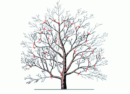 เริ่มแรกคุณต้องตรวจสอบต้นไม้อย่างระมัดระวังและค้นหากิ่งไม้ที่ได้รับผลกระทบในช่วงฤดูหนาว มันอยู่ที่พวกเขาที่ตาใหม่จะหายไปซึ่งแตกต่างจากกิ่งไม้ที่แข็งแรง รูปร่างของเม็ดมะยมจะดีกว่าที่จะเลือกเป็นพวง ในกรณีนี้ควรมีสาขาหลัก (โครงกระดูก) หลายสาขาและสาขาเพิ่มเติมจากพวกเขา ตัวเลือกนี้มีความเกี่ยวข้องเนื่องจากความสามารถในการเพิ่มความเสถียรของต้นไม้และป้องกันการเสียรูปได้ภายใต้อิทธิพลของน้ำหนักของผลไม้ อีกประเด็นที่สำคัญเกี่ยวข้องกับกระบวนการที่สะดวกในการเก็บผลไม้สุก